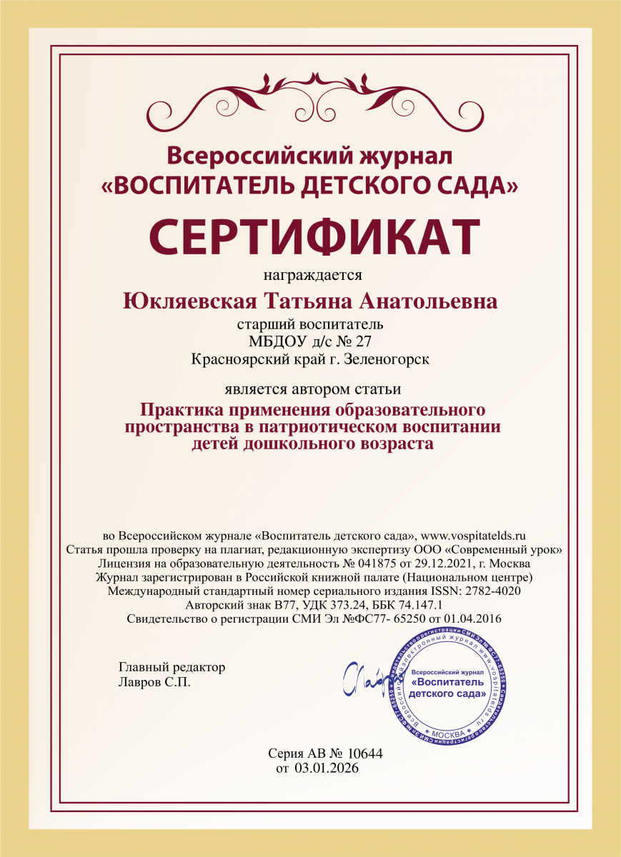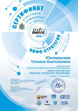 2025г. - сертификат участия в XVI Международной научно-практической конференции "ИНФО-СТРАТЕГИЯ 2025: ОБЩЕСТВО.ГОСУДАРСТВО.ОБРАЗОВАНИЕ", (автор статьи "День рождения LEGO в детском саду" как средство развития творческих и конструктивных способностей дошкольников"
