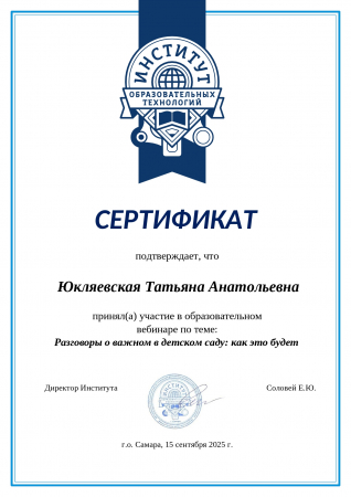 2025г. - сертификат участия в образовательном вебинаре по теме: Разговоры о важном в детском сапду: как это будет.