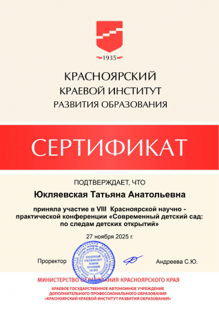 2025г. - сертификат участия в VIII Краснояркой научно-практической конференции "Современный детский-сад: по следам детских открытий"
