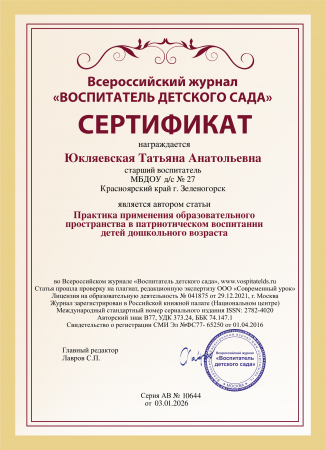 2024г. - сертификат за участие в выставке методических разработок и дидактических пособий в рамках городского фестиваля инновационных педагогических практик "Механизмы повышения качества образования в образовательных учреждениях г. Зеленогорска на современном этапе". Секция: "Реализация направления Концепции развития дошкольного образования Красноярского края на период до 2025 года в процессе внедрения ФОП ДО"