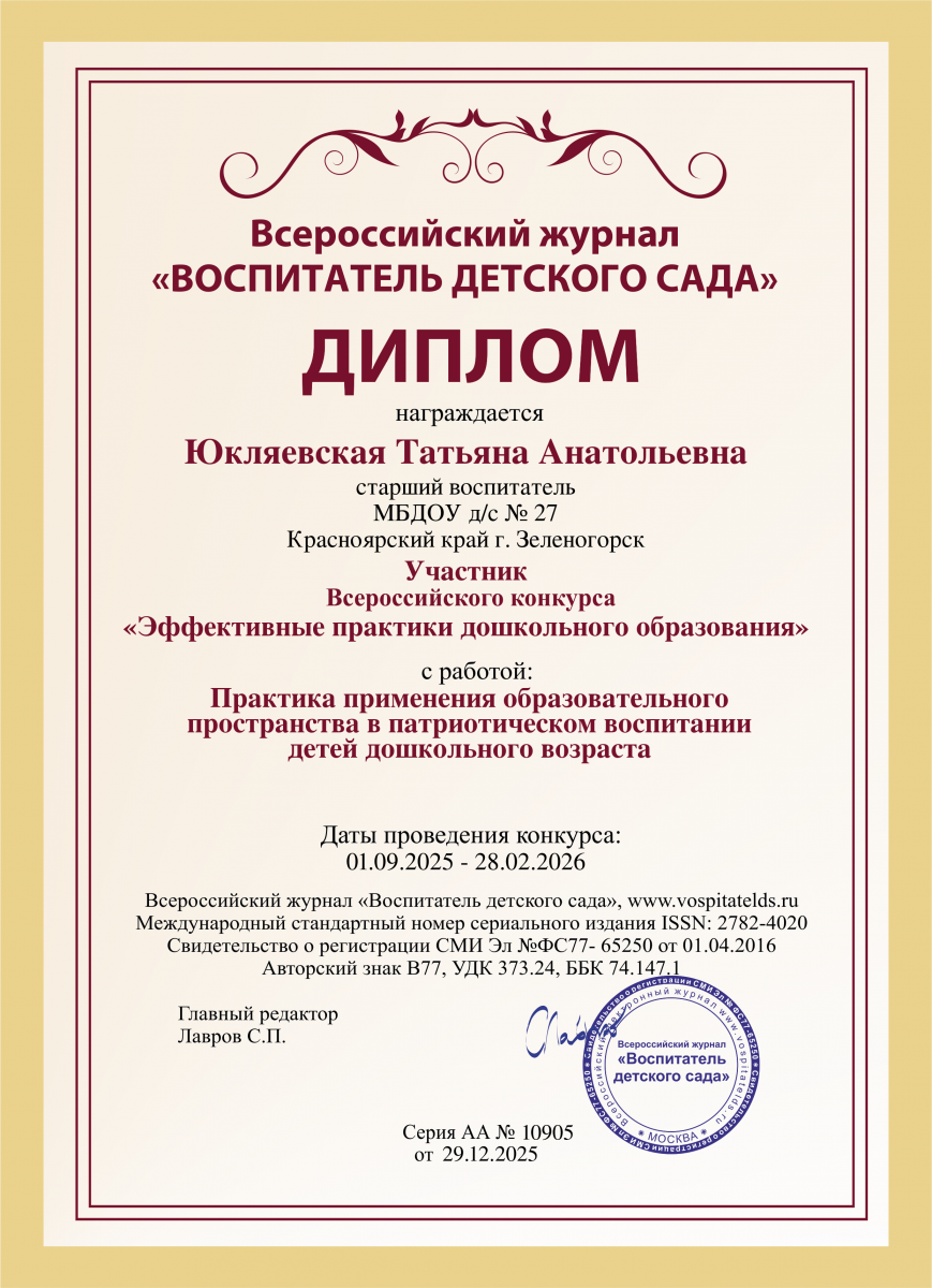 2025г. - диплом участника Всероссийского конкурса "Эффективные практики дошкольного образования" с работой "Практика применения образовательного пространства в патриотическом воспитании детей дошкольного возраста".