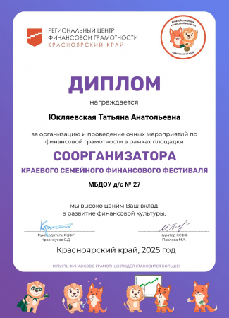 2025г. - диплом соорганизатора Краевого семейного финансового фестиваля (за организацию и проведение очных мероприятий по финансовой грамотности)